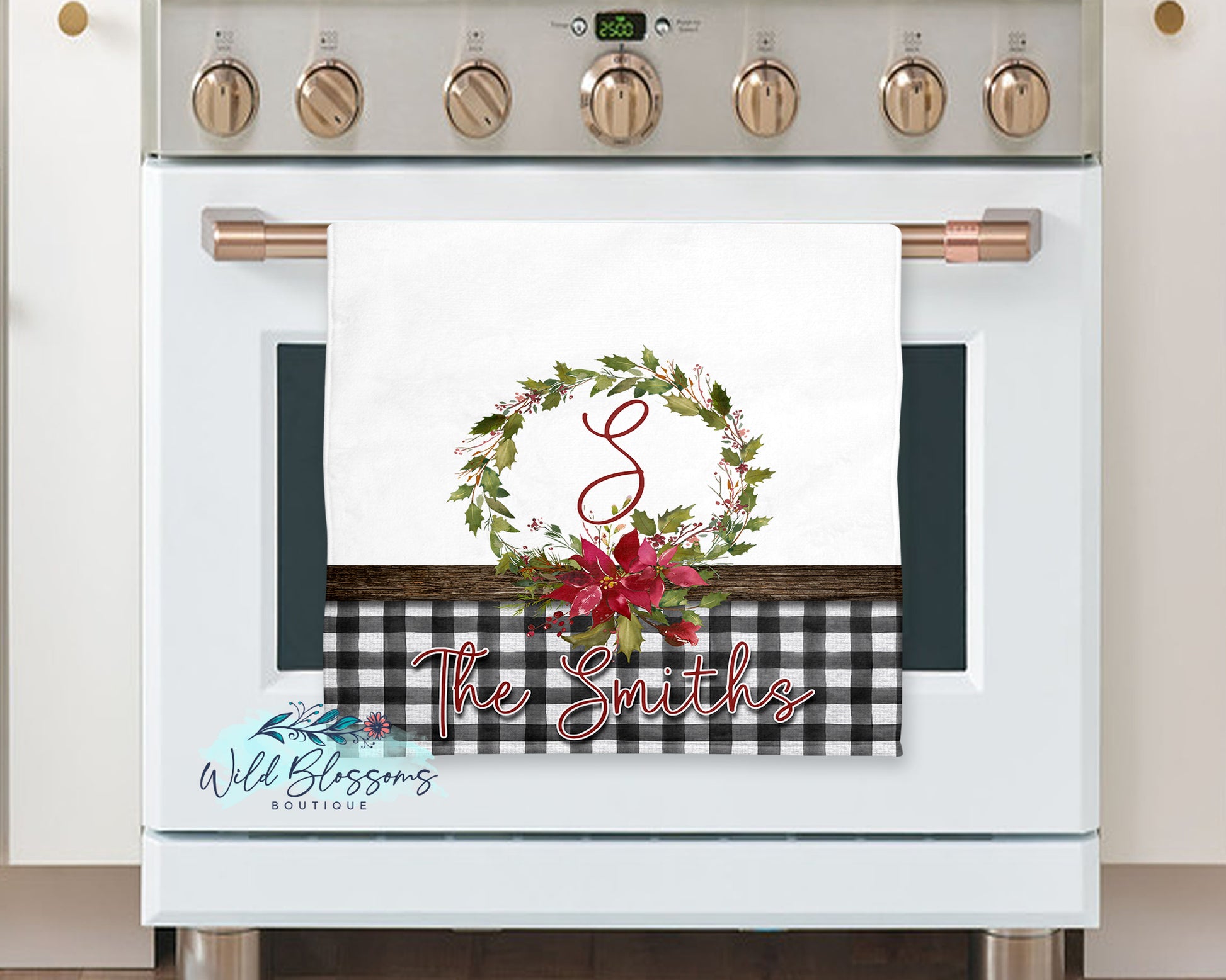Buffalo Plaid Poinsettia Floral Wreath Personalized Kitchen Towel