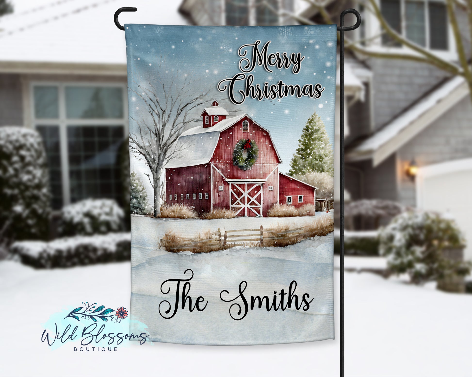 Merry Christmas Rustic Red Barn Personalized Garden Flag