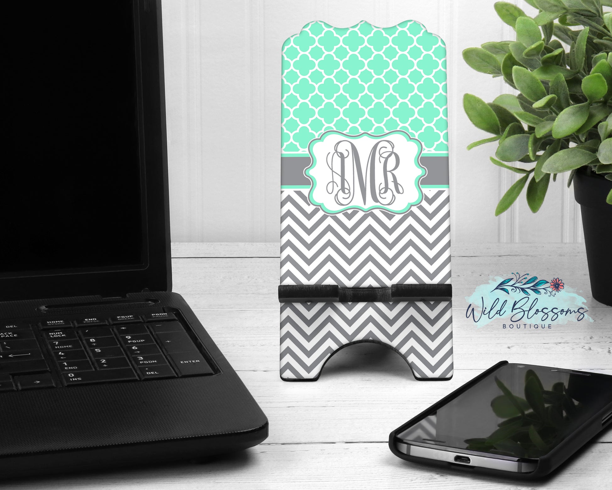 Mint And Grey Monogram Phone Stand