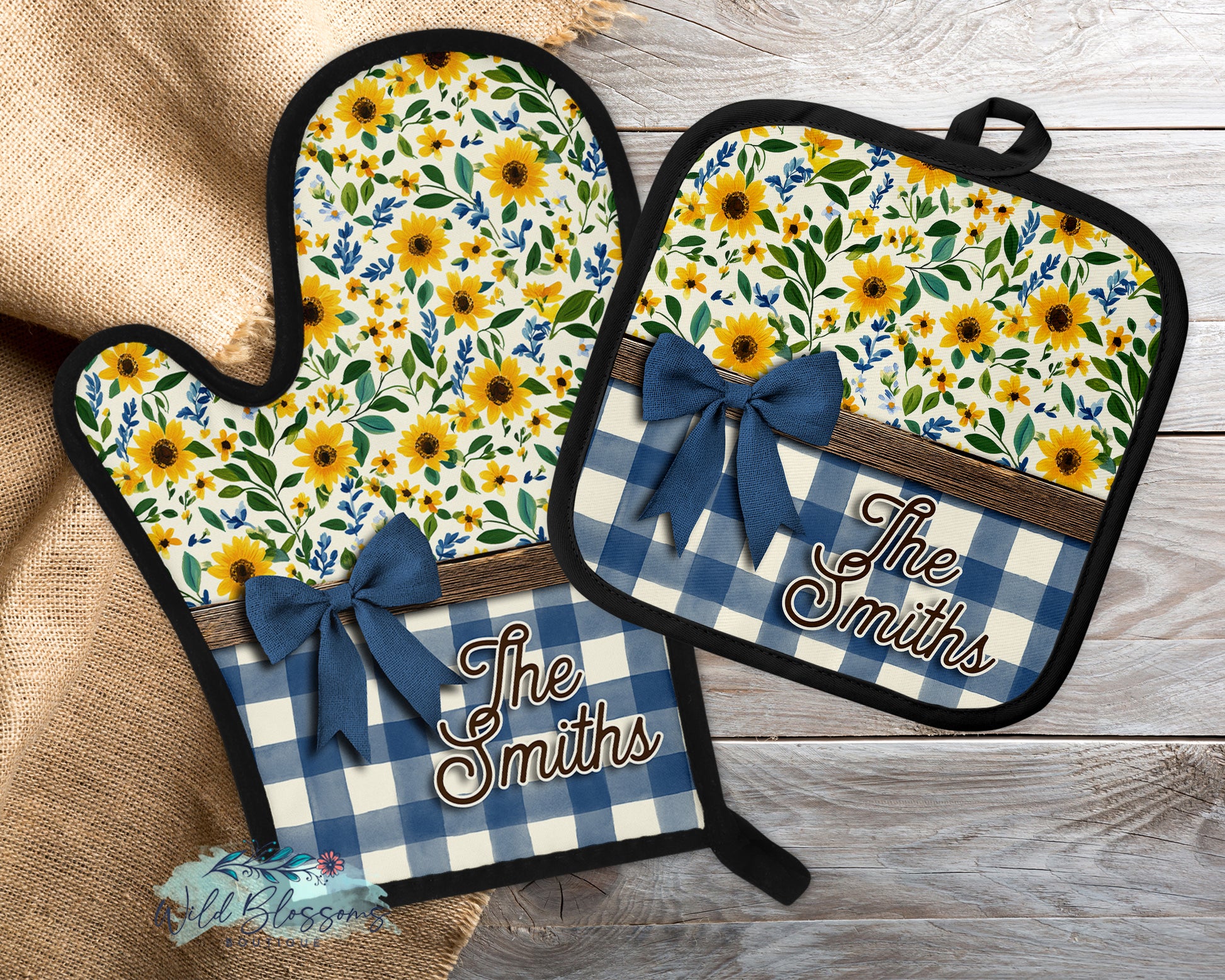 Protect your hands in style with this charming personalized pot holder and oven mitt set. Featuring a striking navy buffalo plaid background adorned with cheerful sunflower florals, this duo brings warmth and personality to your kitchen. Perfect for everyday cooking or as a thoughtful housewarming gift, the personalization option lets you add a custom touch that makes it uniquely yours. Durable, heat-resistant, and designed to complement any kitchen décor, this set combines practicality with rustic charm. Make meal prep safer and more delightful.