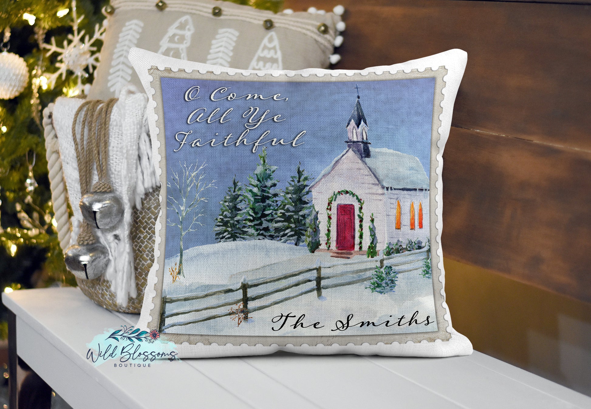 O Come All Ye Faithful White Church Postage Stamp Personalized Pillow Cover