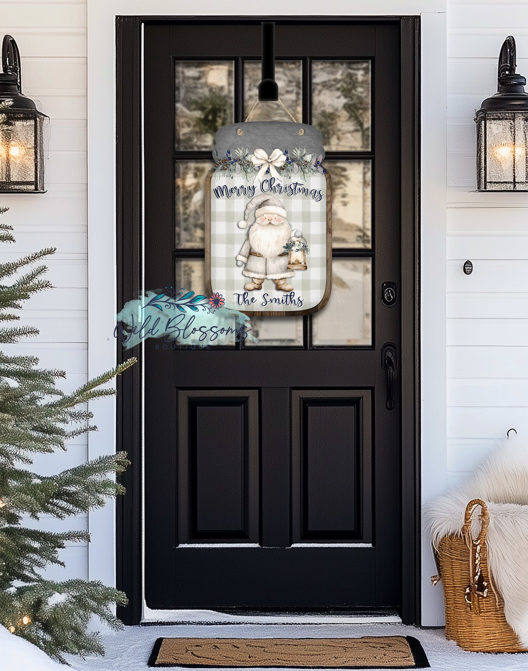 Rustic Santa Sage Buffalo Plaid Floral Personalized Mason Jar Door Hanger