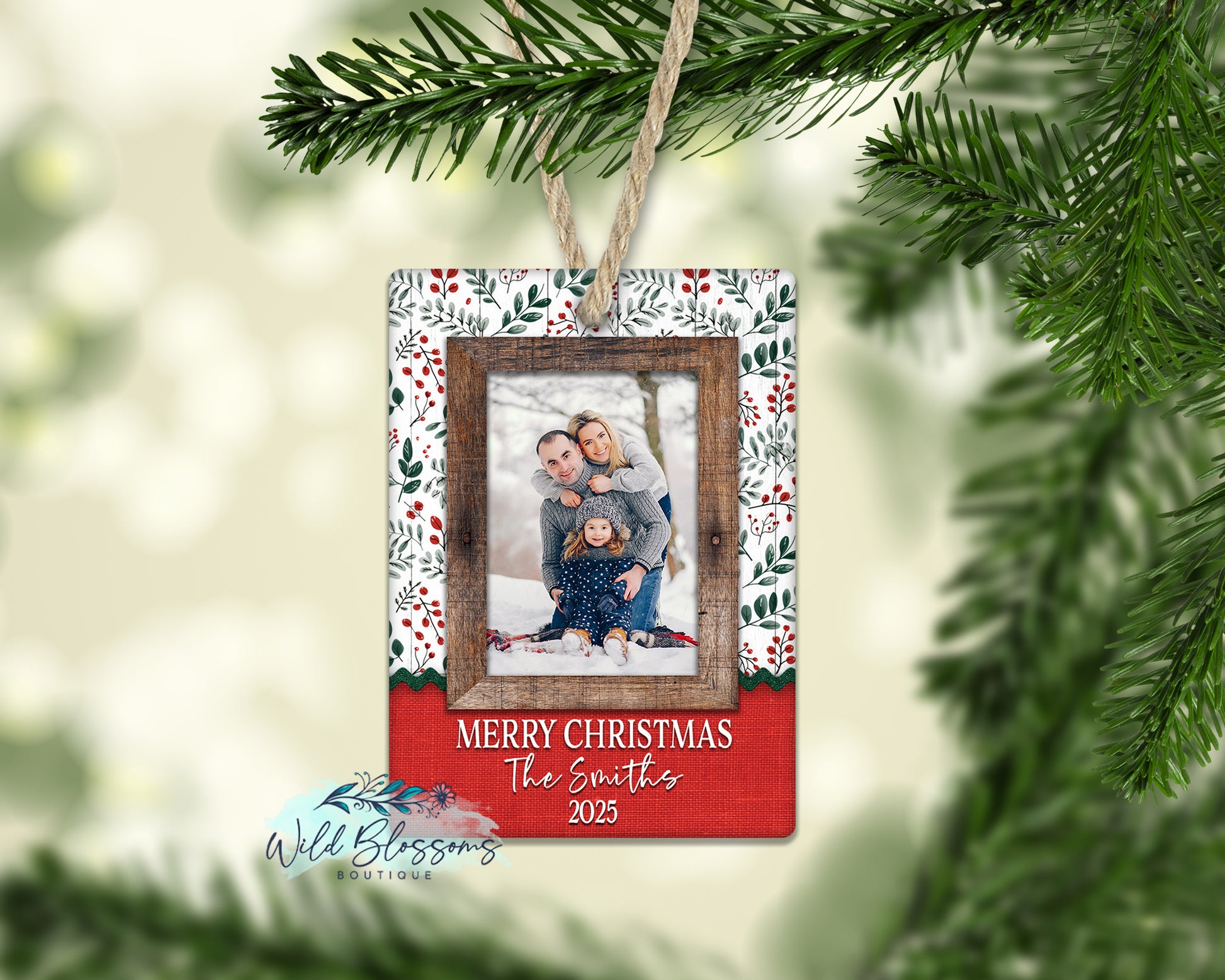 Rustic Wood Frame Christmas Berry Personalized Photo Ornament